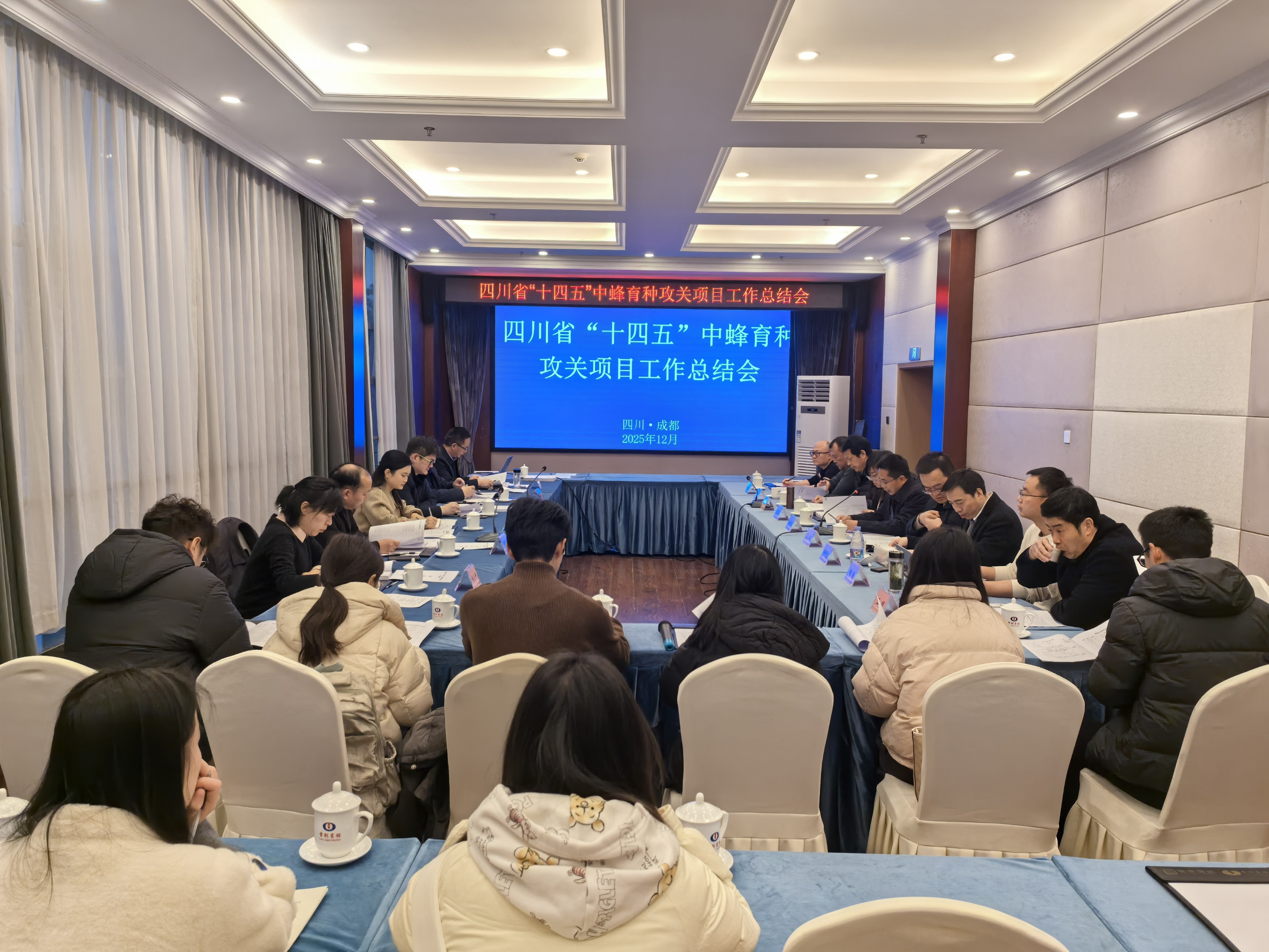 2025年12月19日,四川省“十四五”中蜂育种攻关项目工作总结及子课题验收会在成都召开。会议由四川省饲料工作总站站长舒长斌主持,省农业农村厅科教处副处长秦玉霞、省农业科学院科技处何希德研究员、重庆师范大学许金山教授,重庆市畜牧科学院罗文华研究员、贵州省农科院现代农业发展研究所韦小平研究员、广元市畜牧种业管理站正高级畜牧师唐友海等专家组成验收组,对项目各子课题“十四五”进展情况进行考评。院蚕业所蜜蜂研究中心副主任周晓康畜牧师率团队成员陈宝瑞副研究员、王潇研究实习员参会。四川农业大学、成都众鑫种蜂场、四川省蜂业技术开发有限公司等项目参与单位共20余人参加会议。