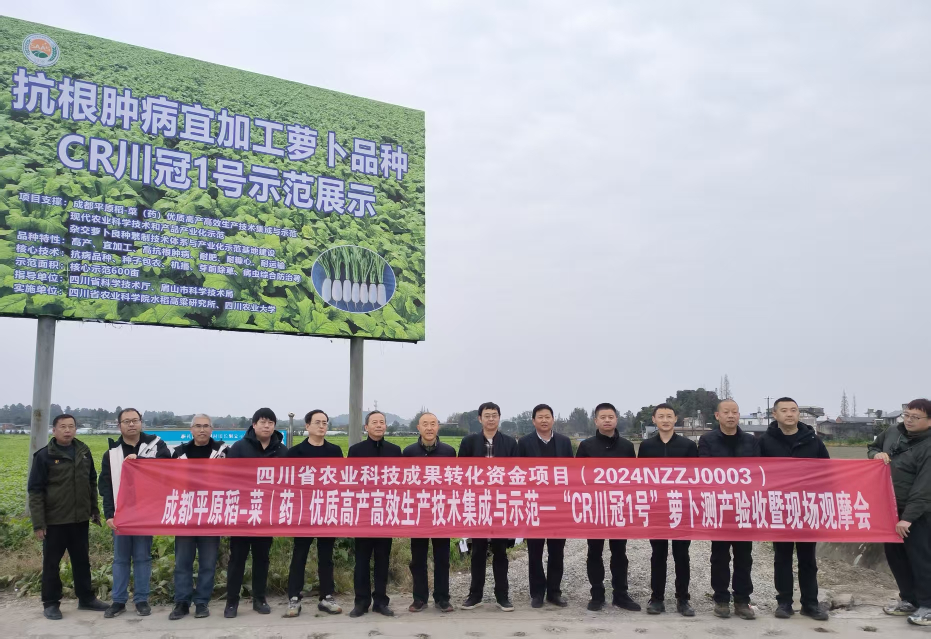 为深入实施四川省科技厅农业科技成果转化项目“成都平原稻-菜(药)优质高产高效生产技术集成与示范”,加快推进抗根肿病萝卜品种“CR川冠1号”的示范推广,12月23日至24日,院水稻高粱所萝卜团队联合四川卓豪农业有限公司在眉山市东坡区组织召开了“CR川冠1号”萝卜测产验收暨现场观摩会。四川省农村科技发展中心副主任冯文帅,眉山市科技局副局长吴洪波,四川农业大学教授马均等领导到会指导。省农科院研究员李跃建,省种子站站长马晖,四川农业大学科技管理处副处长杜俊波,四川东坡中国泡菜产业技术研究院副院长张伟以及中国农科院都市农业研究所副研究员杨晓等领导组成测产专家组。