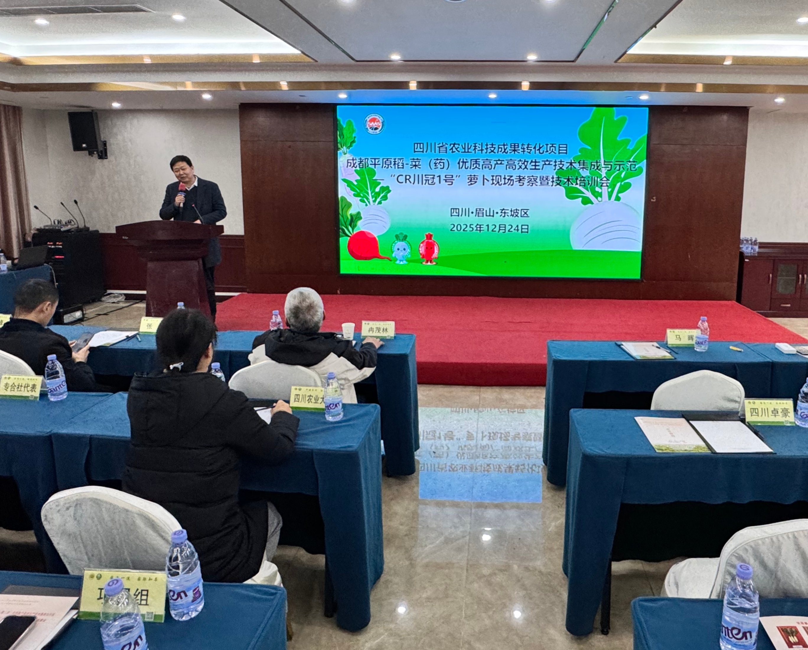 最后,马晖站长作总结讲话,他对“CR川冠1号”的优异表现和项目取得的成果给予了高度评价,并指出该品种有效破解了眉山当地萝卜产业的核心痛点。他对下一步工作提出三点期望:一是持续深化品种迭代与适应性研究;二是以点带面扩大示范推广,打造优质产业链品牌;三是健全“科研单位+政府+企业+农户”的长效协同机制,让良种良法真正落地生根,为持续擦亮四川农业大省“金字招牌”、助力乡村产业振兴贡献力量。