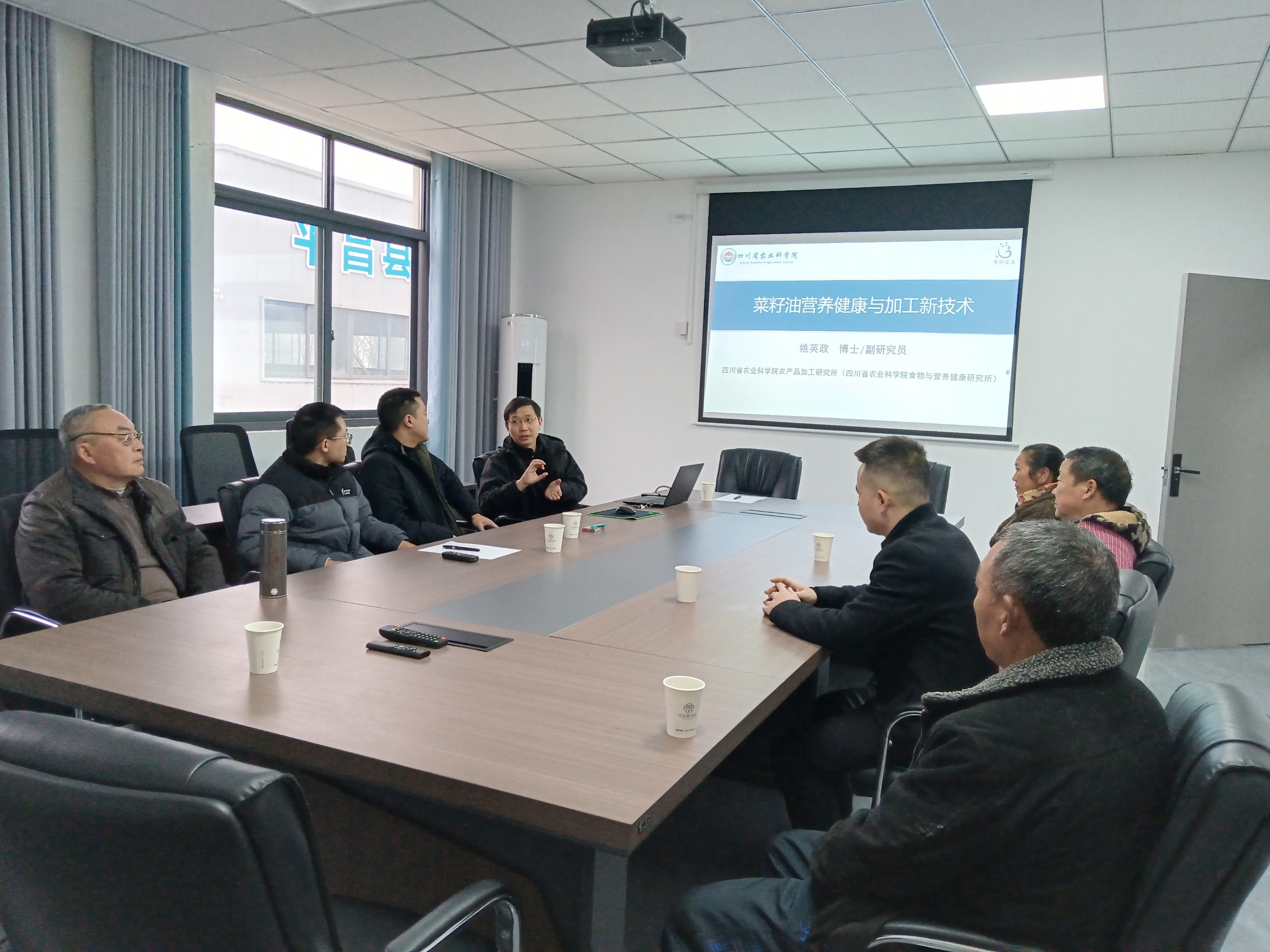 12月24日,四川油菜创新团队岗位专家姚英政副研究员在企业负责人陪同下参观了园区展馆和粮油加工生产线,随后为油脂加工企业管理和技术人员开展了题为《菜籽油营养健康与加工新技术》的技术培训,结合科学数据和实践经验介绍了菜籽油的营养健康价值、国内外加工技术与应用现状以及市场发展趋势,并进行了技术交流与探讨。