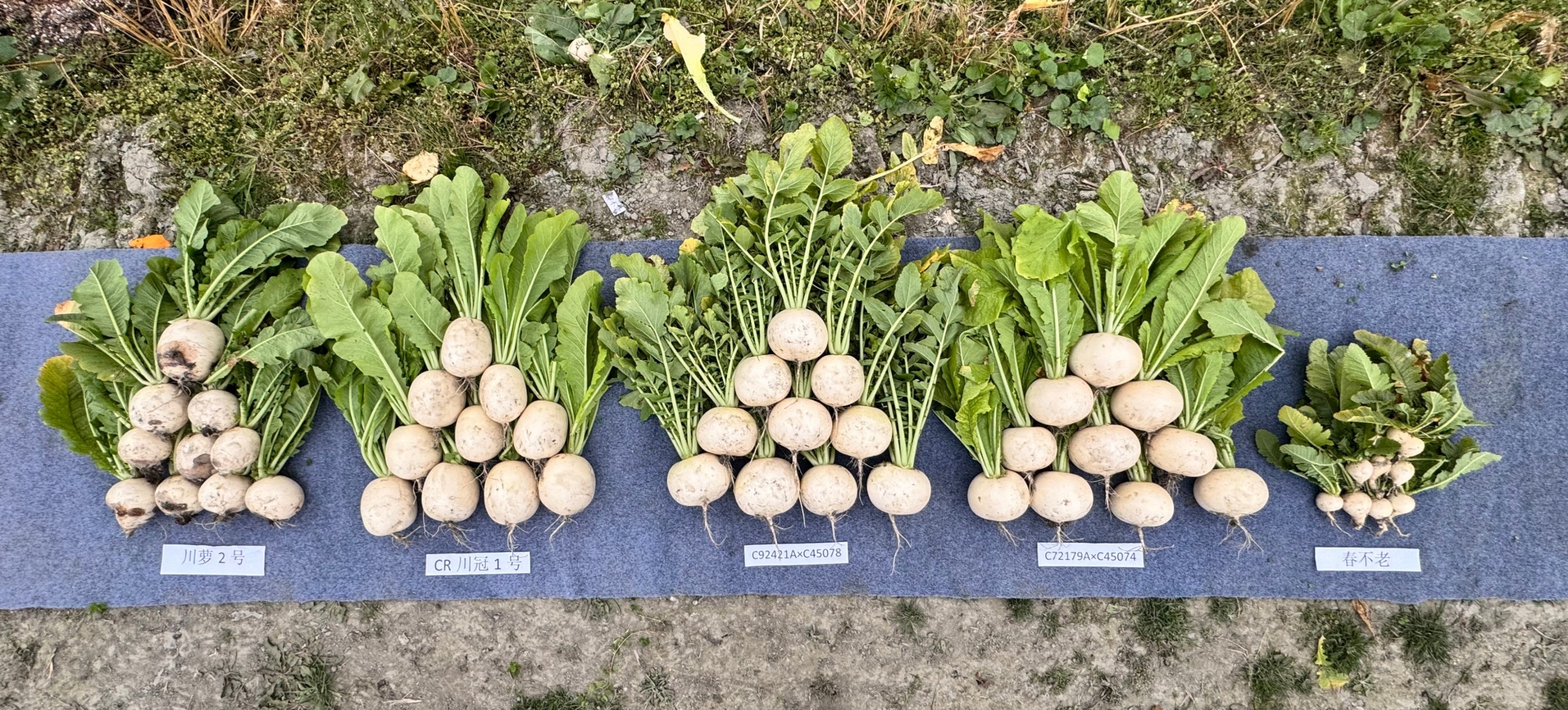 据课题组汇报,两个组合是综合运用传统育种技术与基于基因定位的分子标记辅助选育,历经十年系统选育而成。两个组合均为中熟品种,高抗根肿病、软腐病,且根型圆整、商品性佳,实现了抗病与优质性状的协同提升。其中,“C92421A×C45078”为花叶,肉质根皮亮白光滑,宜鲜销,连续两年多点试验平均亩产比“春不老”增产60%以上;“C72179A×C45074”为板叶,肉质根干物质含量与脆度高,宜加工,连续两年多点试验平均亩产比“春不老”增产50%以上。