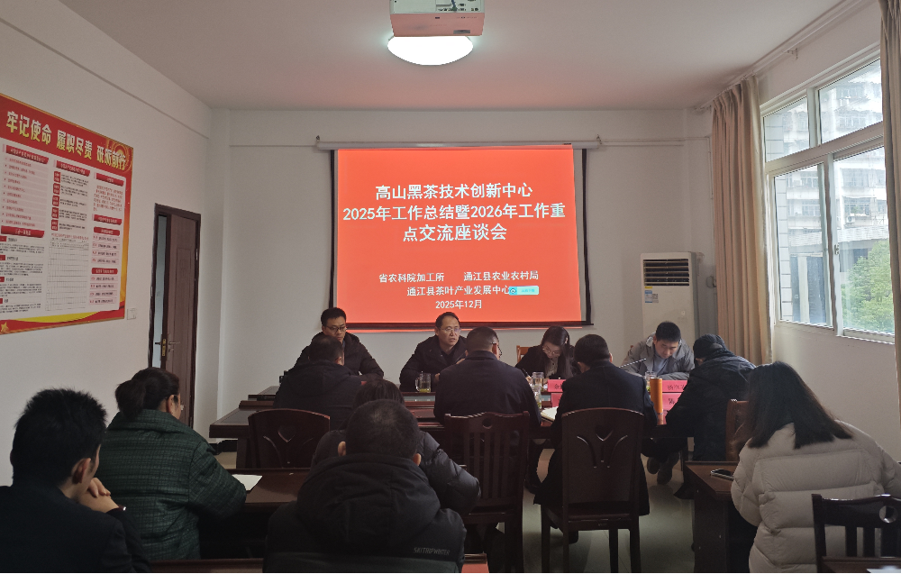 会上,加工所功能食品团队余鳗游博士围绕“四川高山黑茶技术创新中心”2025年建设运行情况作专题汇报。创新中心是由省农科院加工所、通江嘉茗茶业有限公司、通江县茶叶产业发展中心三方共建的“政产研”协同创新平台,致力于高山黑茶全链条提质升级。自成立以来,创新中心通过高频次沟通对接和项目协作,逐步形成“顶层设计—项目谋划—落地实施—跟踪服务”的全链条合作模式,有力支撑通江高山黑茶产业系统布局与整体提升。与会各方一致认为,创新中心在基地建设、关键技术攻关、标准与项目谋划、政产研协同等方面取得了显著成效,并对年度工作给予了高度认可和充分肯定。