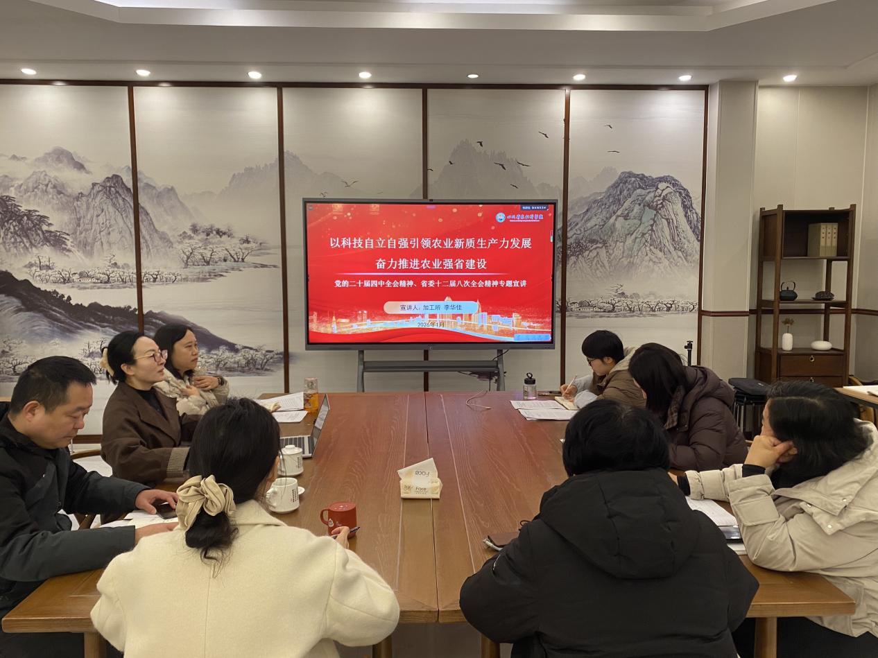 为深入学习党中央关于“三农”工作、经济工作和全面从严治党的重要决策部署,贯彻落实党的二十届四中全会及省委十二届八次全会精神,切实将全会精神转化为推动院加工所高质量发展的强大动力,所行政党支部于1月19日组织开展专题学习会,重点学习了中央农村工作会议、中央经济工作会议及二十届中纪委五次全会等会议精神,所党委副书记、所长李华佳专题宣讲党的二十届四中全会及省委十二届八次全会精神。会议由所行政支部书记廖淇主持,党支部全体党员参加。
