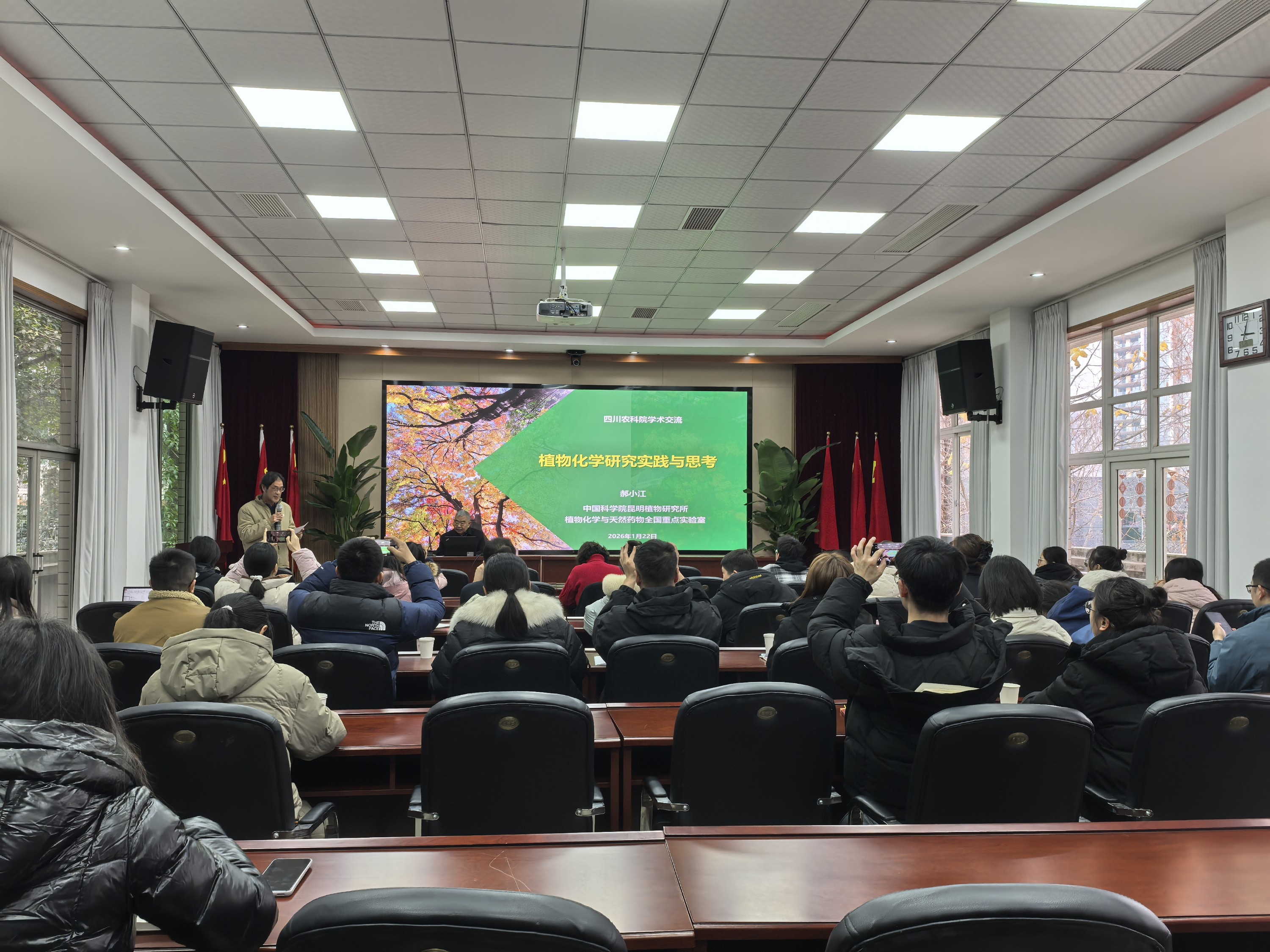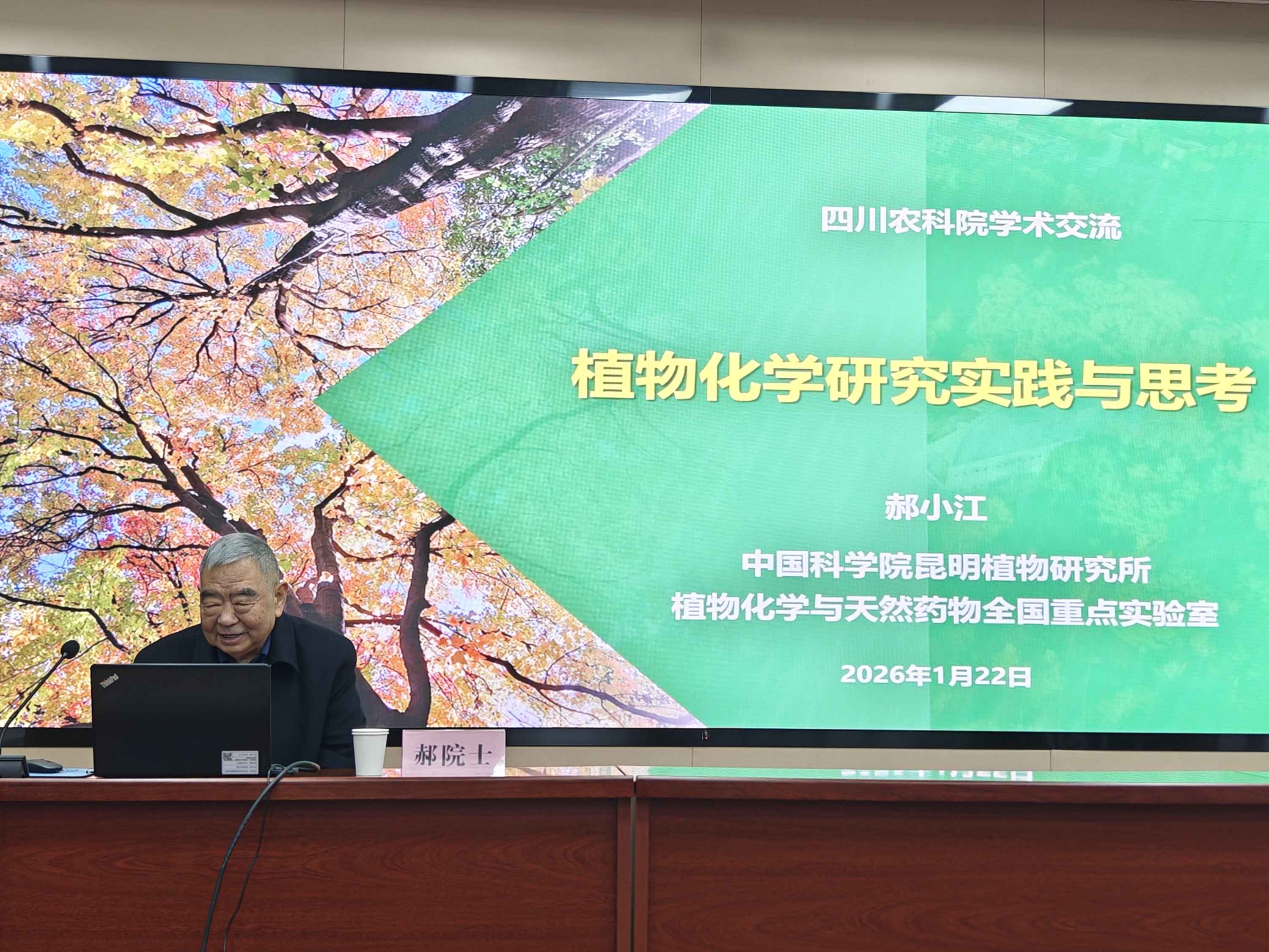 2026年1月22日下午,四川省农业科学院“1+9”揭榜挂帅科技攻关(生物安全前沿技术)项目组在院作物所品质楼二楼会议室召开交流会,特邀中国科学院院士、中国科学院昆明植物研究所郝小江研究员,作题为《植物化学研究实践与思考》的专题学术报告。交流会由项目首席专家刘勇研究员主持,吸引了院植保所、质标所、作物所、生核所、经作所、畜科院、西南民族大学等高校和科研机构共40余名科研人员参会交流。
