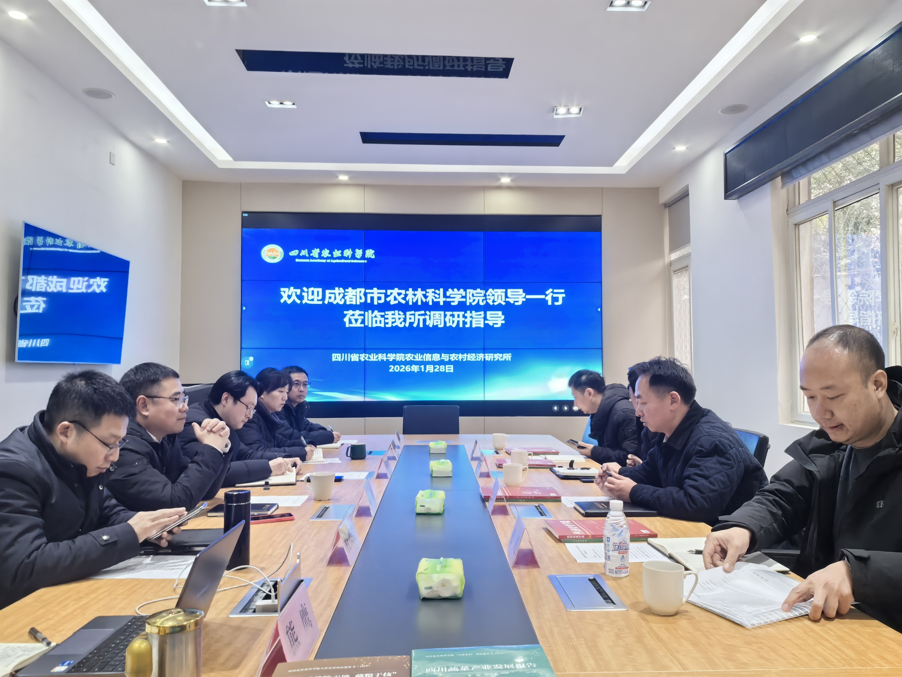 2026年1月28日,成都市农林科学院副院长舒航、都市农业研究所所长王富全及相关科研人员一行4人到院信息农经所调研交流。所党委书记何鹏、所党委副书记、所长林正雨、所纪委书记、副所长杜兴端、所总经济师赵颖文,以及科管办和农经研究中心的负责人参加此次座谈交流。