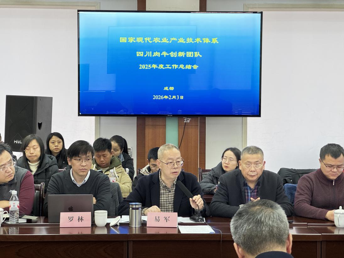 2026年2月3日,国家现代农业产业技术体系四川肉牛创新团队2025年度工作总结会在省畜科院五楼会议室顺利召开。会议由四川省畜牧科学研究院党委委员、总畜牧师、牛业科学研究所所长、四川肉牛创新团队首席专家易军研究员主持,省农业农村厅科技教育处处长周美川、二级主任科员殷佳丽到会指导。省农业农村厅草原牧业处处长付建勇、省饲料工作总站站长舒长斌、省畜牧总站副站长王斌、省农科院科管处副处长刘伟、省农科院农业信息与农村经济研究所总经济师赵颖文组成的指导专家组,以及创新团队信息平台管理人员、产业副首席、岗位专家和各岗位成员等40余人参加会议。