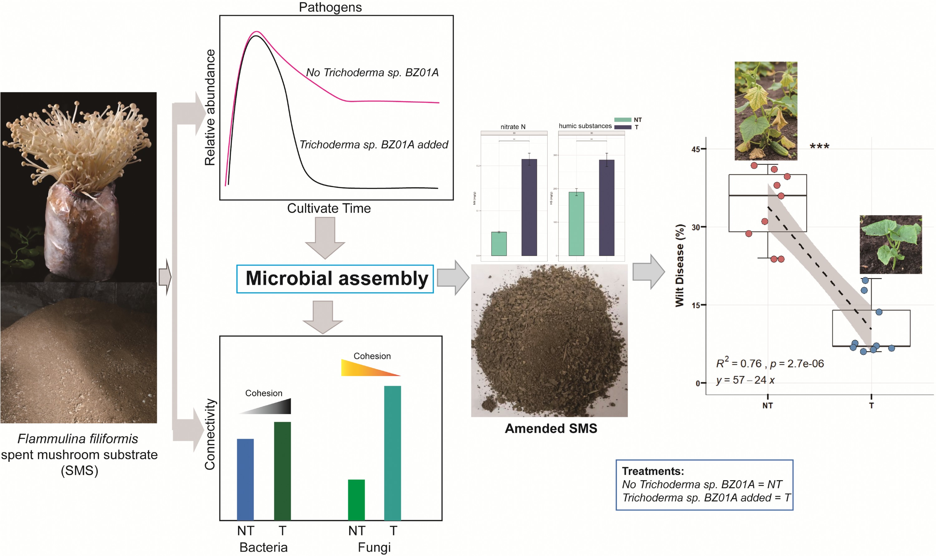 食用菌产业每年产生大量废菌渣,是发酵成生物有机肥的优良原料。省食用菌所向金针菇废菌渣发酵有机肥的起始物料中添加基于棘孢木霉的非模式底盘细胞BZ01A,以添加辐照失活菌株的处理为对照。棘孢木霉BZ01A在有机肥发酵过程中大量扩繁,有效提升了废菌渣中含量丰富的真菌残体几丁质向腐殖质转化的关键酶活力和转化效率,重塑了微生物群落结构,使真菌群落中以尖孢镰刀菌为主的镰刀菌属亚群体比例从接近15%降至低于1%。共现网络分析揭示,添加BZ01A使真菌群落相关关系的网络结构简化,模块度更高,与镰刀菌的连接度降低,最终堆肥产品具有显著的抑制镰刀菌枯萎病的效果。路径分析揭示,被BZ01A重塑的真菌群落组成是影响菌渣有机肥生防效果的首要因素。